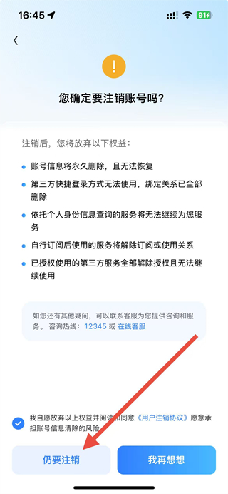 4、在賬號(hào)注銷確認(rèn)頁(yè)面勾選同意相關(guān)協(xié)議,點(diǎn)擊仍要注銷按鈕,按提示完成賬號(hào)注銷流程。