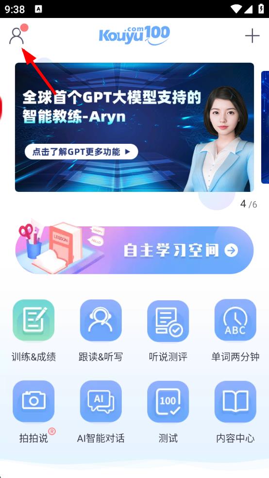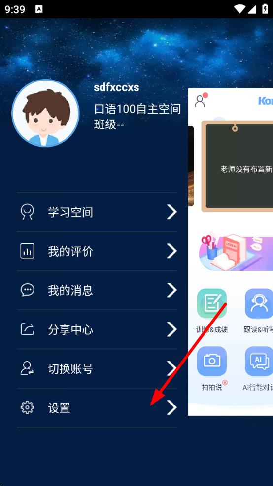 1、打開口語100應(yīng)用,點擊左上角頭像圖標,展開側(cè)邊欄菜單界面。