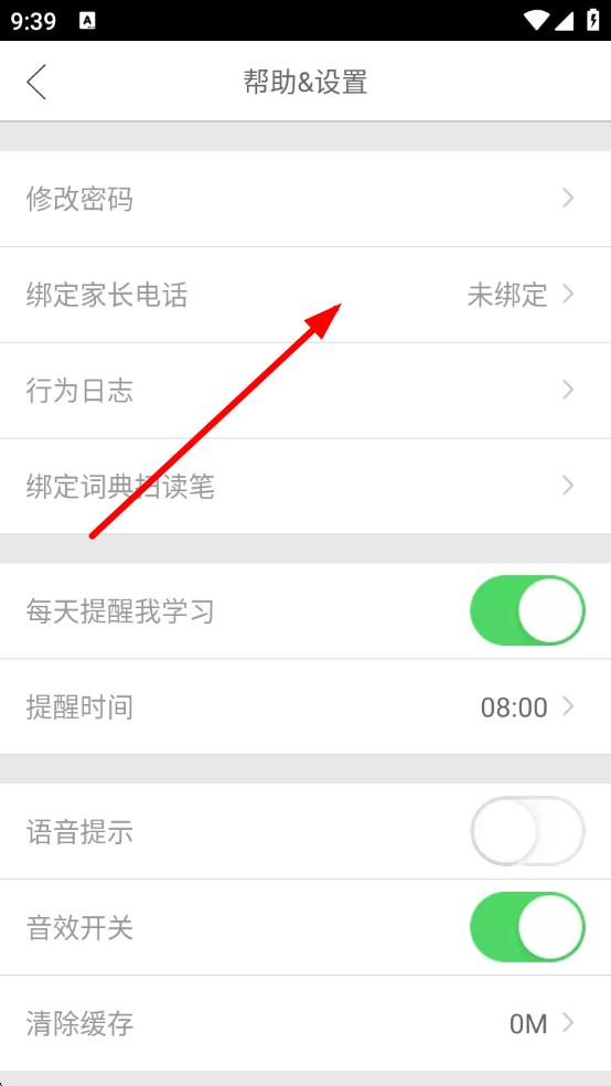 3、在幫助&設(shè)置頁面里,點擊綁定家長電話選項,按照后續(xù)提示操作完成家長手機號碼綁定。