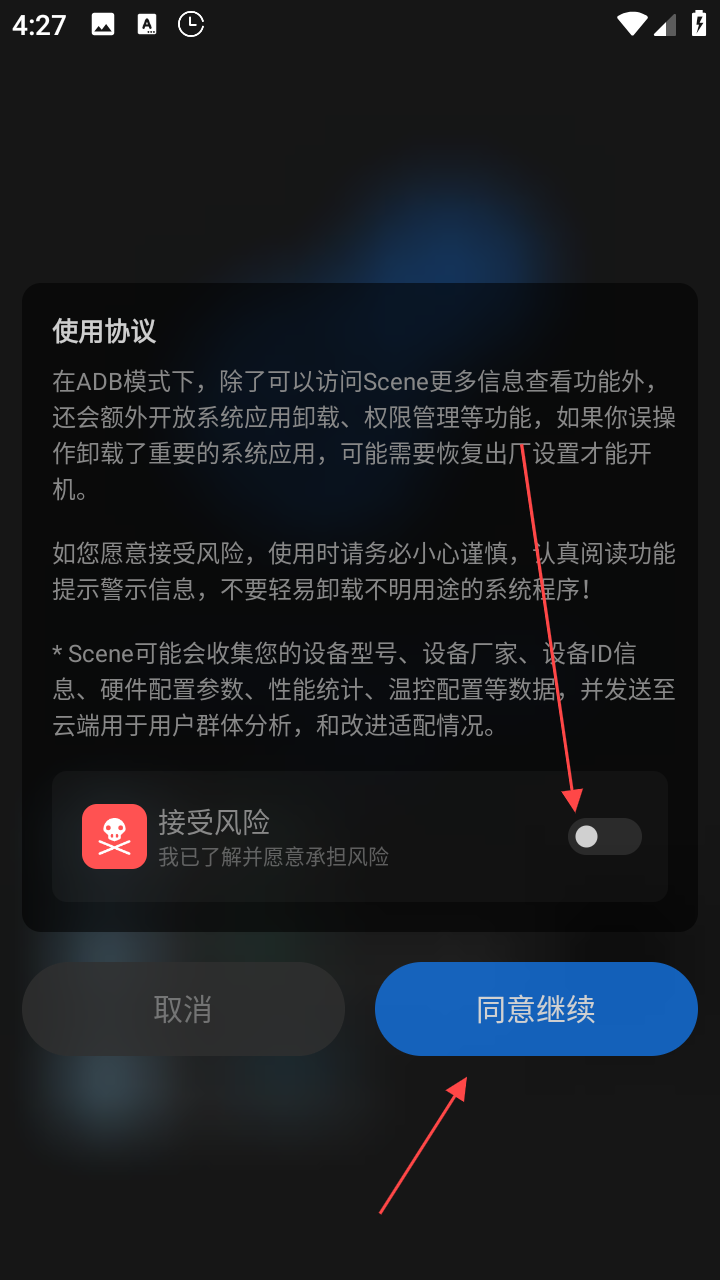 2、在彈出的使用協(xié)議界面中,仔細(xì)閱讀相關(guān)協(xié)議內(nèi)容,然后點擊接受風(fēng)險的開關(guān)按鈕,開啟該選項,再點擊同意繼續(xù)按鈕。