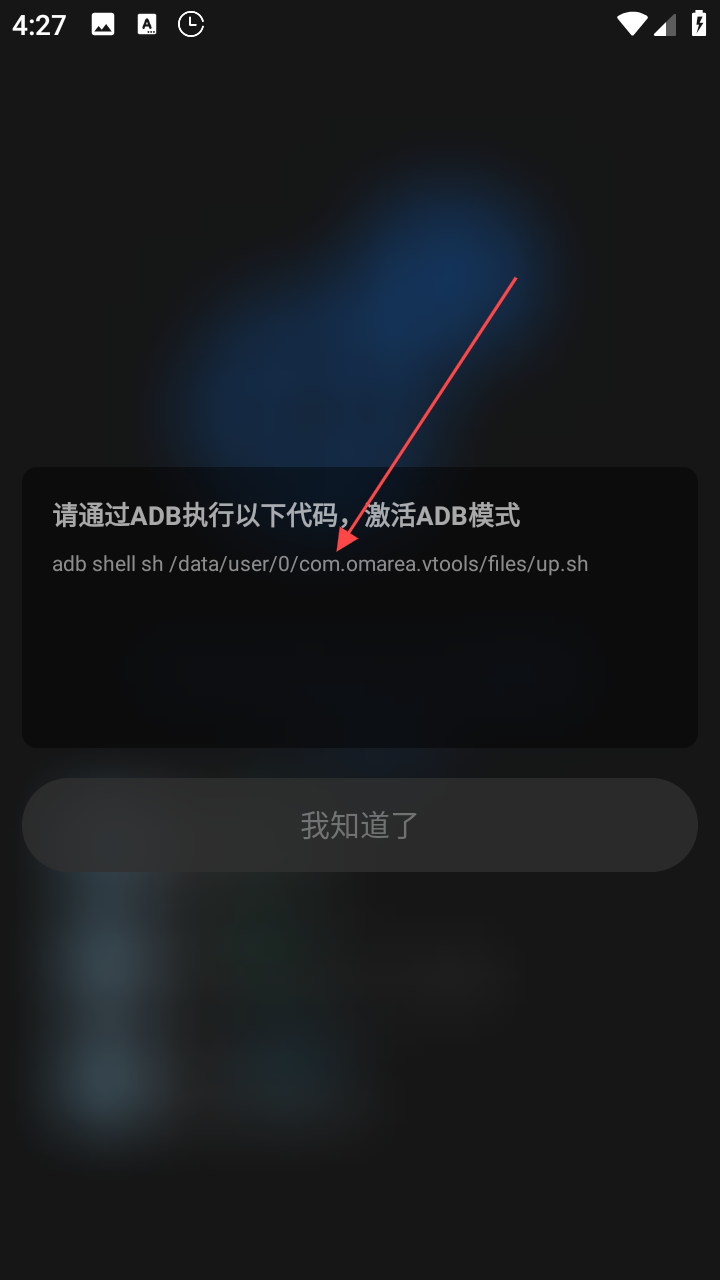 3、在新彈出的提示框中,會顯示激活A(yù)DB模式需要執(zhí)行的代碼,執(zhí)行完成后即可激活A(yù)DB模式。
