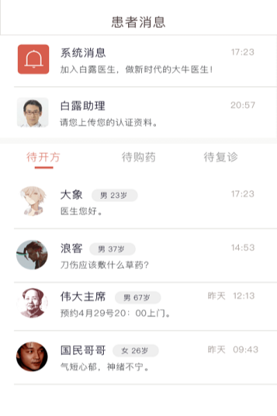 固生堂醫(yī)生端是一款助力中醫(yī)師的移動(dòng)醫(yī)療app,可以幫助中醫(yī)師實(shí)現(xiàn)患者管理、醫(yī)生在線開方、在線配藥,以及中醫(yī)師品牌宣傳。白露醫(yī)館擁有三甲醫(yī)院的認(rèn)證中醫(yī),重新定義了互聯(lián)網(wǎng)時(shí)代的“望、聞、問、切”,針對(duì)各種體制、疑難雜癥,提供健康調(diào)理方案,為用戶解決使用中藥的問題。