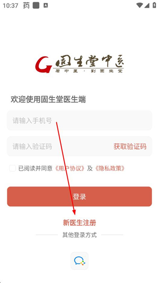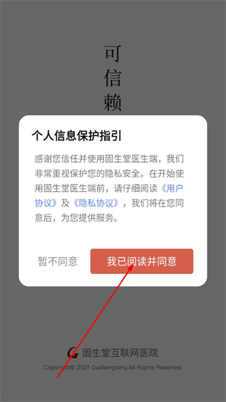 1、在固生堂醫(yī)生端App的個(gè)人信息保護(hù)指引彈窗中,點(diǎn)擊我已閱讀并同意,進(jìn)入登錄/注冊(cè)頁面。