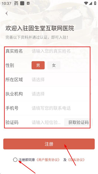 3、填寫真實(shí)姓名、性別、所在區(qū)域等信息,勾選同意協(xié)議后點(diǎn)擊注冊(cè),完成注冊(cè)流程。