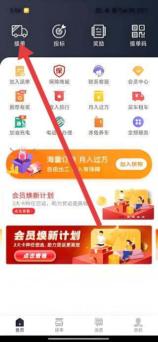1、在快狗打車司機(jī)版首頁(yè),點(diǎn)擊左上角接單圖標(biāo),進(jìn)入工作臺(tái)頁(yè)面,查看接單與加盟相關(guān)入口。