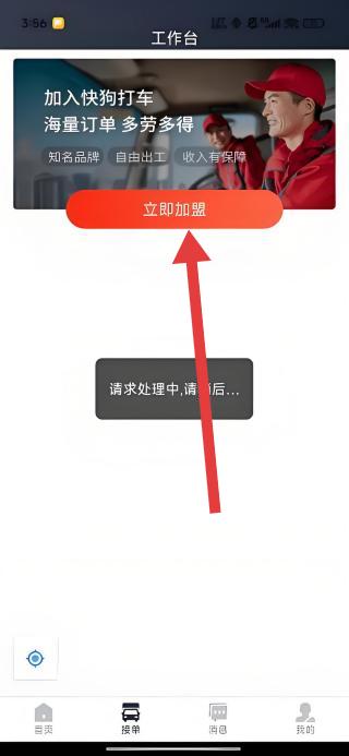 2、要接單首先需要加盟在工作臺(tái)界面,通過點(diǎn)擊紅色立即加盟按鈕,跳轉(zhuǎn)至司機(jī)加盟頁(yè)面,啟動(dòng)加盟流程。