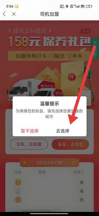 3、彈出溫馨提示彈窗后,可以點(diǎn)擊去選擇按鈕,挑選擬加盟的城市,推進(jìn)司機(jī)加盟操作后開始接單。