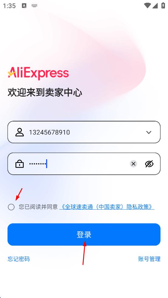 3、輸入完賬戶名和密碼后,勾選您已閱讀并同意全球速賣通(中國(guó)賣家)隱私政策。