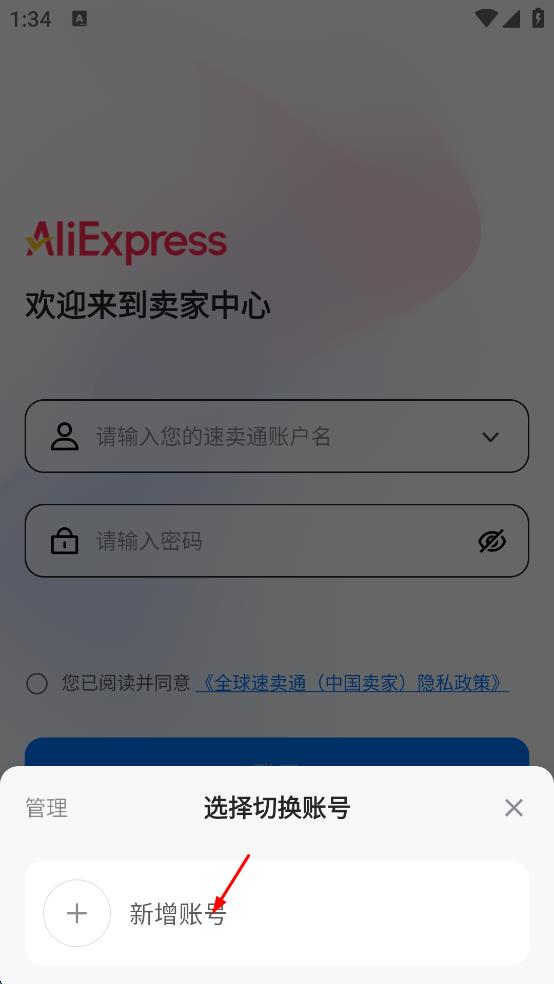 1、打開相關(guān)頁(yè)面后,點(diǎn)擊返回箭頭,進(jìn)入到速賣通賣家中心登錄相關(guān)頁(yè)面,若需要切換賬號(hào),可點(diǎn)擊新增賬號(hào)選項(xiàng)。