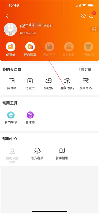 2、在個人中心頁面點擊去加入藥店,進入加入店鋪頁面。