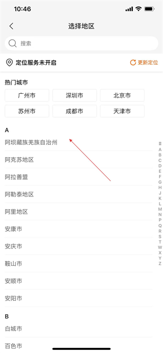 4、在選擇地區(qū)頁面選擇所在地區(qū),進入選擇店鋪頁面。