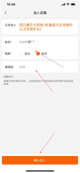 6、在加入店鋪信息填寫頁面選擇身份,填寫邀請碼,點擊確認加入。