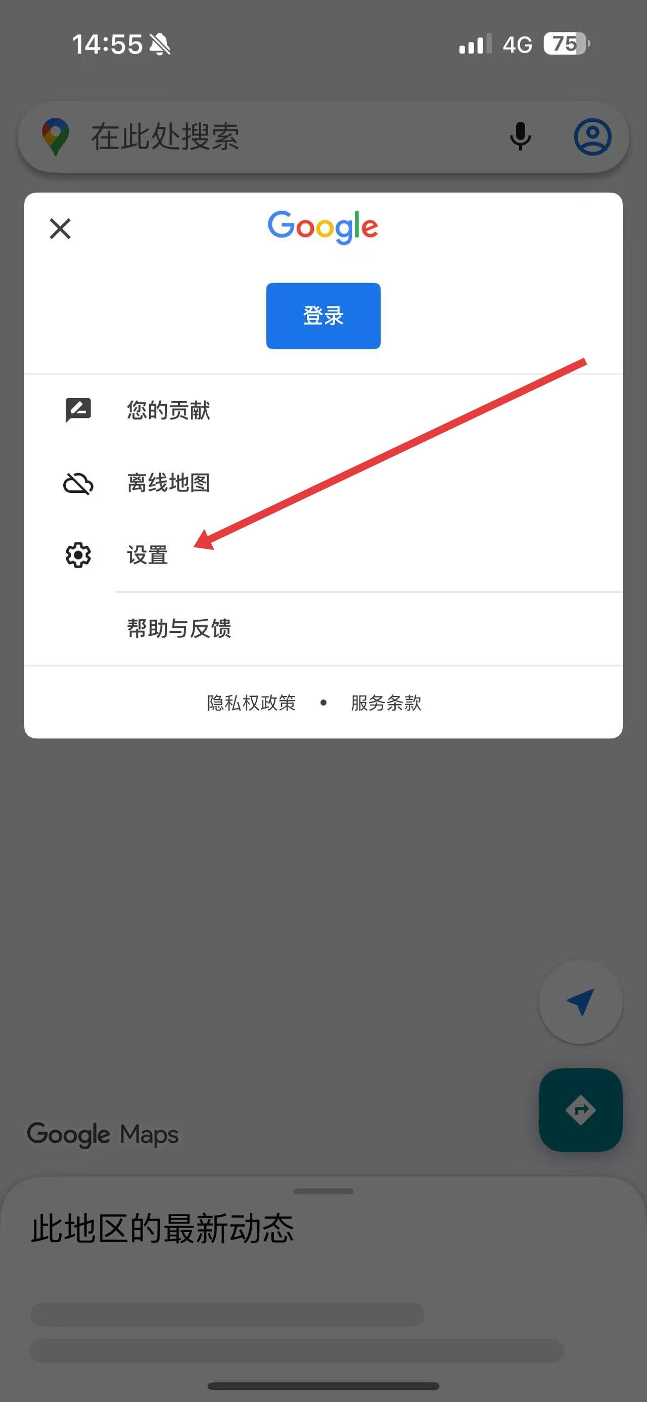 1、打開谷歌地圖App,點(diǎn)擊左上角搜索框,在彈出菜單中選擇設(shè)置選項(xiàng)。