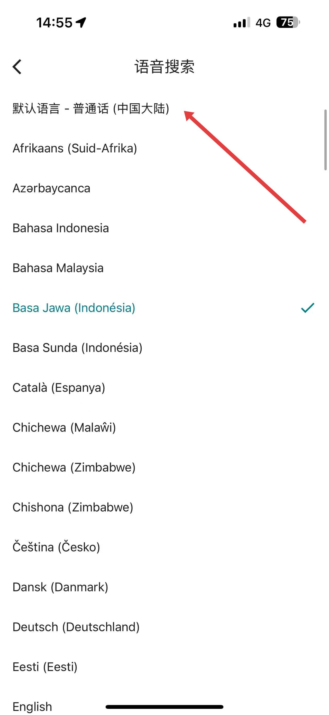 3、在語音搜索設(shè)置界面中,找到并點(diǎn)擊默認(rèn)語言-普通話中國(guó)大陸選項(xiàng),即可將谷歌地圖語音搜索設(shè)置為中文模式。