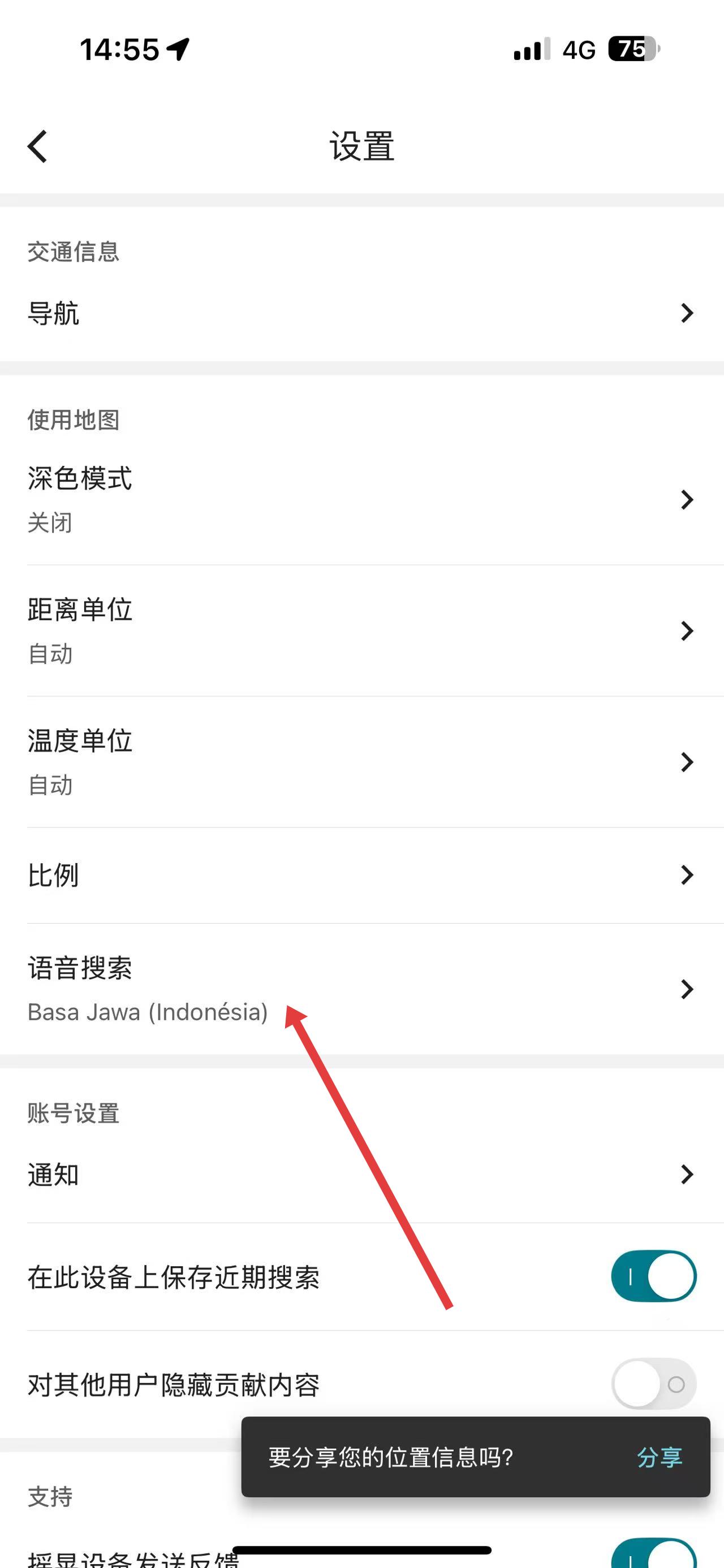 2、進(jìn)入設(shè)置頁(yè)面后,點(diǎn)擊語音搜索選項(xiàng),進(jìn)入語音搜索設(shè)置界面。