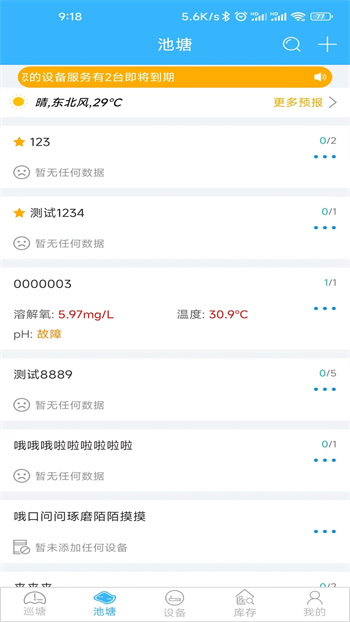 2.巡塘首頁(yè)界面顯示用戶(hù)自己的所有池塘和水質(zhì)分?jǐn)?shù);
