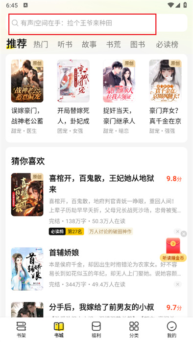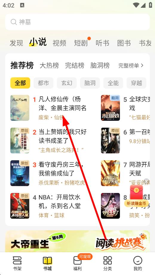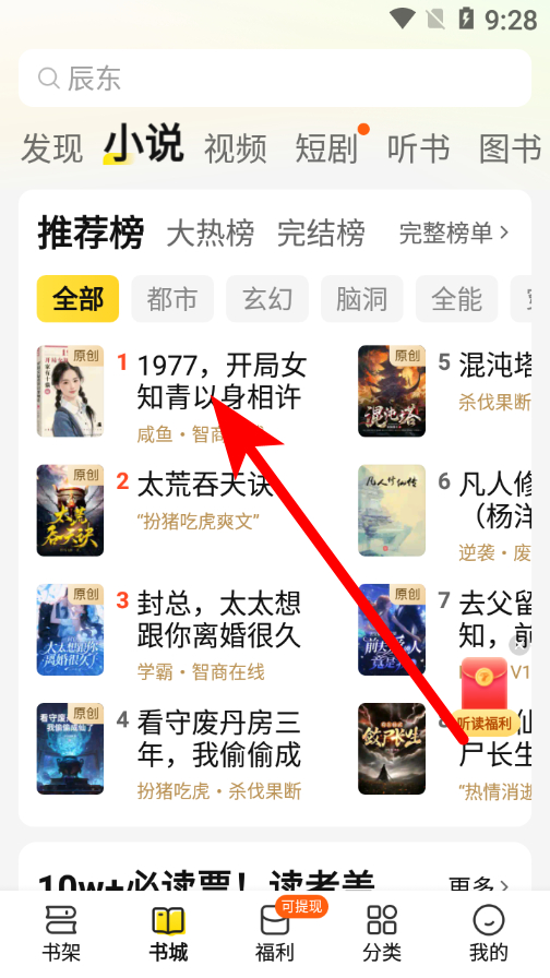2、在書城界面的小說分類下,查看各類榜單,比如推薦榜,找到想要聽書的小說,點擊進(jìn)入小說詳情頁。