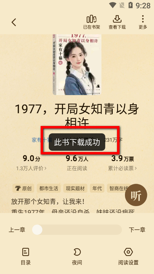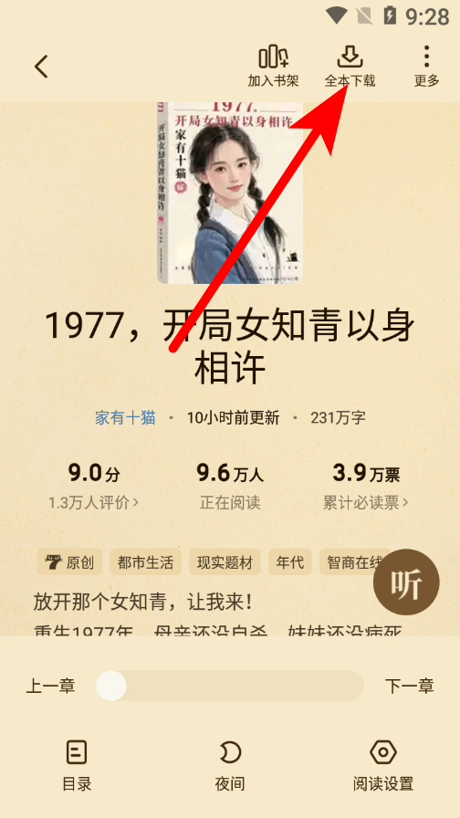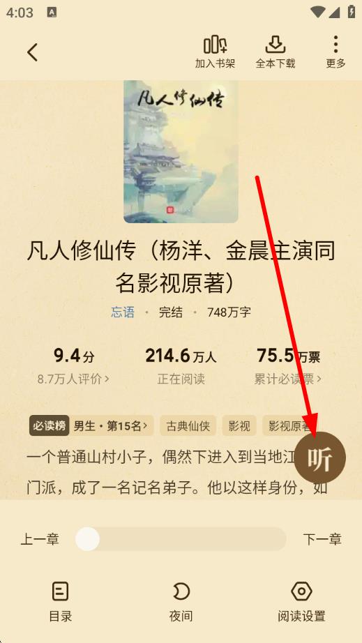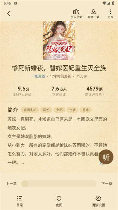 3、在小說詳情頁面,閱讀簡介等信息確認(rèn)后,點擊頁面右下角的聽按鈕,即可開始收聽該小說,享受聽書服務(wù)。