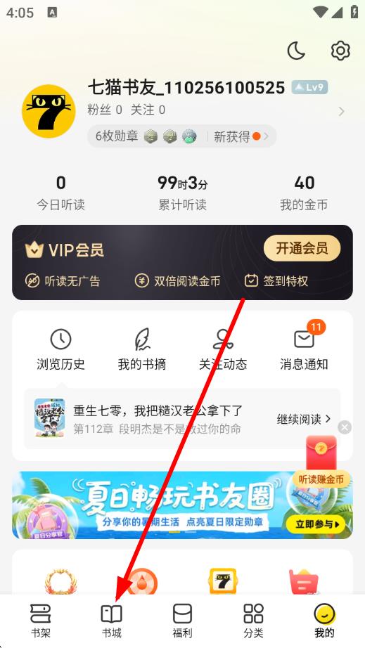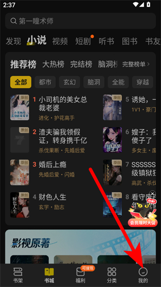 1、打開七貓小說APP,進(jìn)入我的頁面后,點擊底部導(dǎo)航欄中的書城選項,進(jìn)入書城界面,這里有豐富的書籍資源。