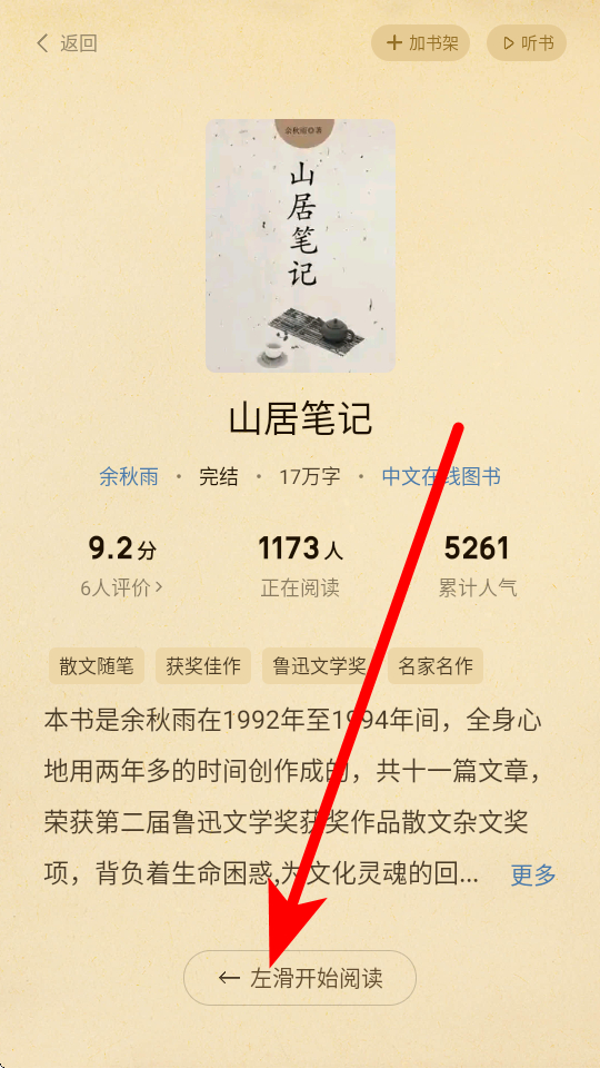 2、在小說詳情界面,點擊左滑開始閱讀按鈕,進(jìn)入小說閱讀界面。