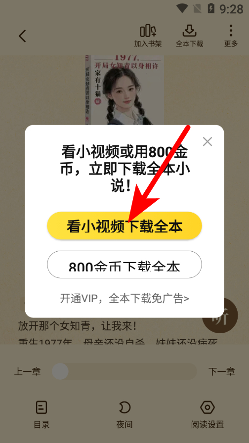 3、在下載方式選擇框中,選擇看小視頻下載全本或用金幣下載全本的方式。