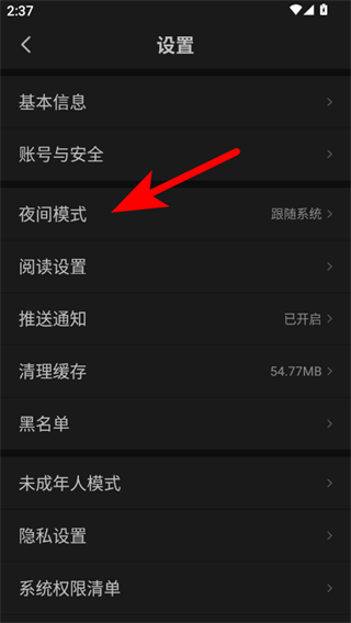 3、在設(shè)置頁面,點擊夜間模式選項,彈出模式選擇框。