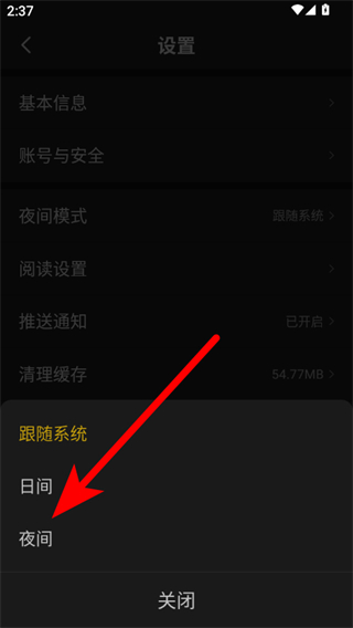 4、在模式選擇框中,點擊夜間選項,即可開啟夜間閱讀模式。