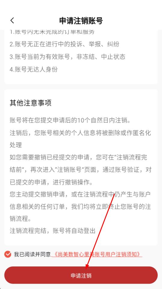 6、接著閱讀注銷須知,勾選我已閱讀并同意《尚美數(shù)智心里美賬號用戶注銷須知》,點擊申請注銷,即可完成心里美酒店會員賬號的注銷。