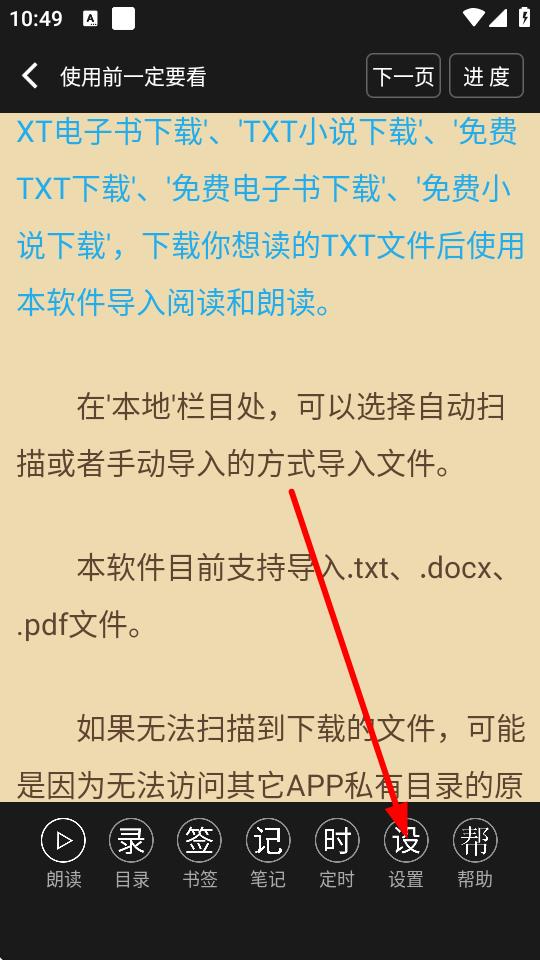 3、在文檔閱讀界面,點擊屏幕調出功能欄,接著點擊設置選項。
