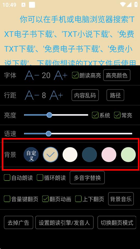 4、在設置界面下方的背景選項區(qū)域,選擇自己喜歡的背景顏色樣式,點擊即可將文檔閱讀背景顏色修改為所選顏色。