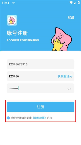 4、勾選我已經(jīng)閱讀并同意隱私政策內(nèi)容的選項(xiàng),點(diǎn)擊注冊(cè)按鈕,完成賬號(hào)注冊(cè)操作。