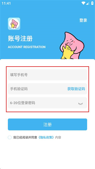 3、在賬號(hào)注冊(cè)界面的輸入框中,依次填寫手機(jī)號(hào)、手機(jī)驗(yàn)證碼和登錄密碼信息。