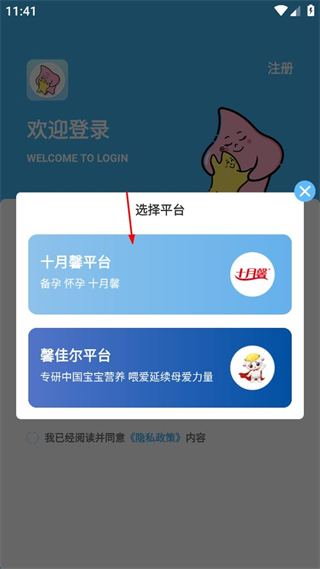 1、進(jìn)入軟件歡迎登錄界面,找到右上角的注冊(cè)選項(xiàng),點(diǎn)擊該選項(xiàng)進(jìn)入平臺(tái)選擇頁面。