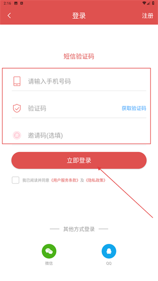 4、進(jìn)入登錄的界面內(nèi),輸入登錄的手機(jī)號、驗(yàn)證碼以及邀請碼,再點(diǎn)擊立即登錄即可。