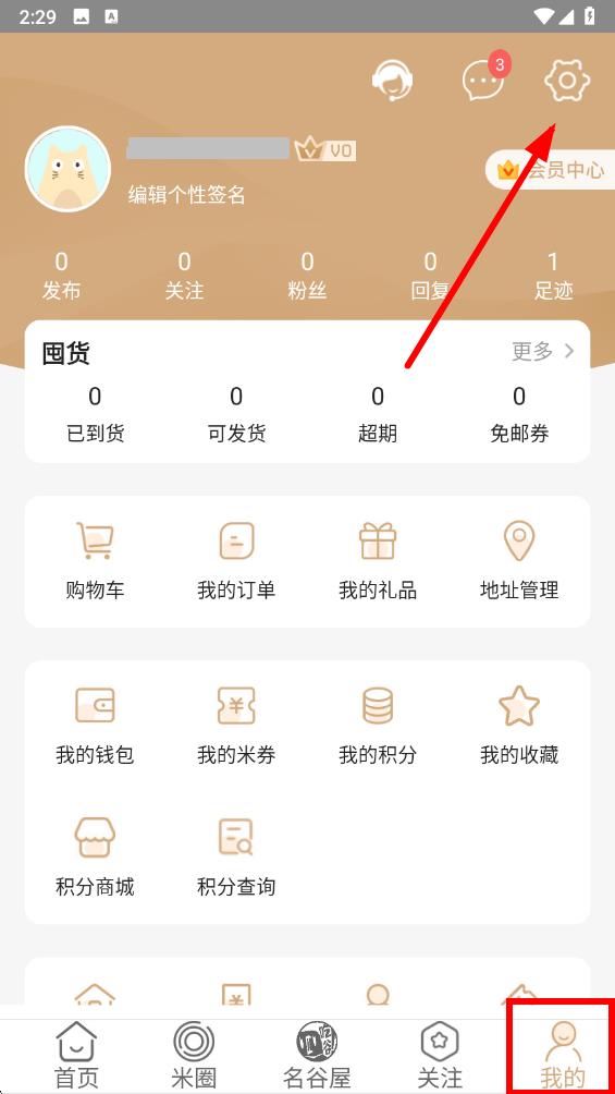 1、打開撒米APP,點擊底部導航欄中的我的選項,進入個人頁面,點擊右上角的設(shè)置圖標。