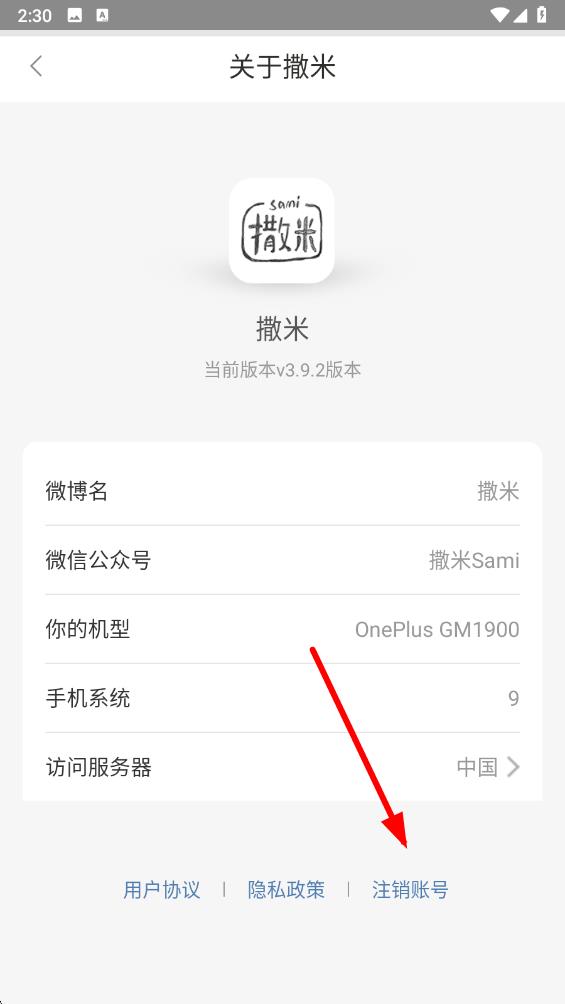 3、在關(guān)于撒米頁面底部,找到注銷賬號選項,點擊該選項后,按照提示完成身份驗證等相關(guān)操作,注銷后賬號數(shù)據(jù)無法恢復。