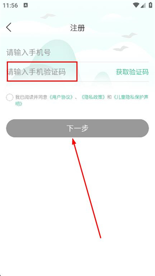 3、輸入收到的手機(jī)驗(yàn)證碼,點(diǎn)擊下方的下一步按鈕。