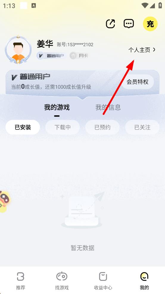 2、在個人頁面中,點擊頭像右側的個人主頁選項,進入個人資料頁面。
