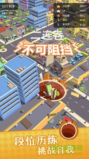 3.為了在競(jìng)爭(zhēng)中占據(jù)主動(dòng),你需要通過(guò)滑動(dòng)屏幕將自己控制的黑洞移動(dòng)至可以吞噬的物體下方進(jìn)行吞噬。樹木,路標(biāo),建筑……凡是在場(chǎng)景中出現(xiàn)的物體都可以吞噬,包括其他黑洞。
