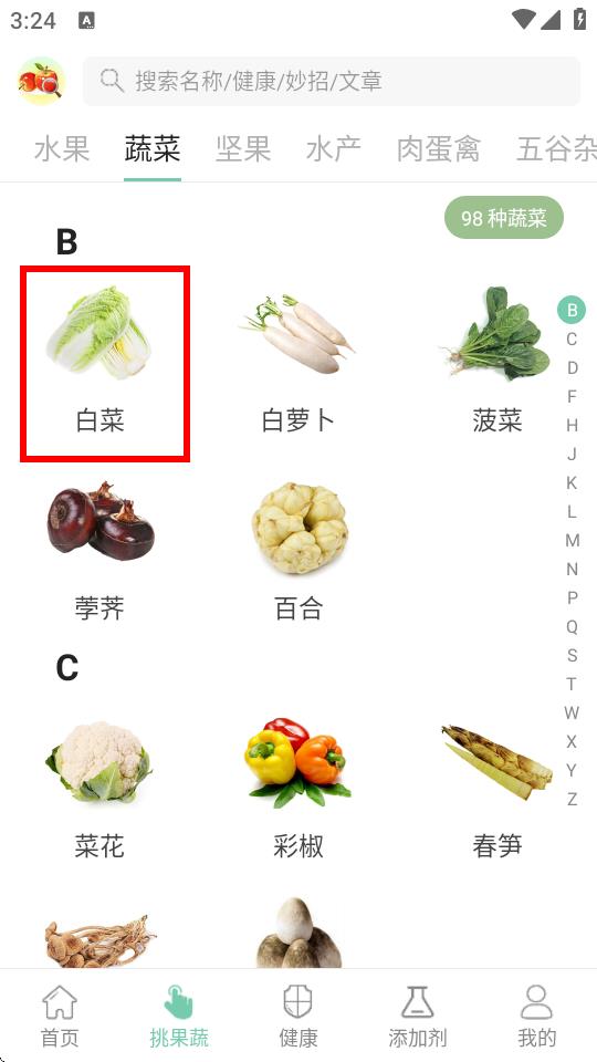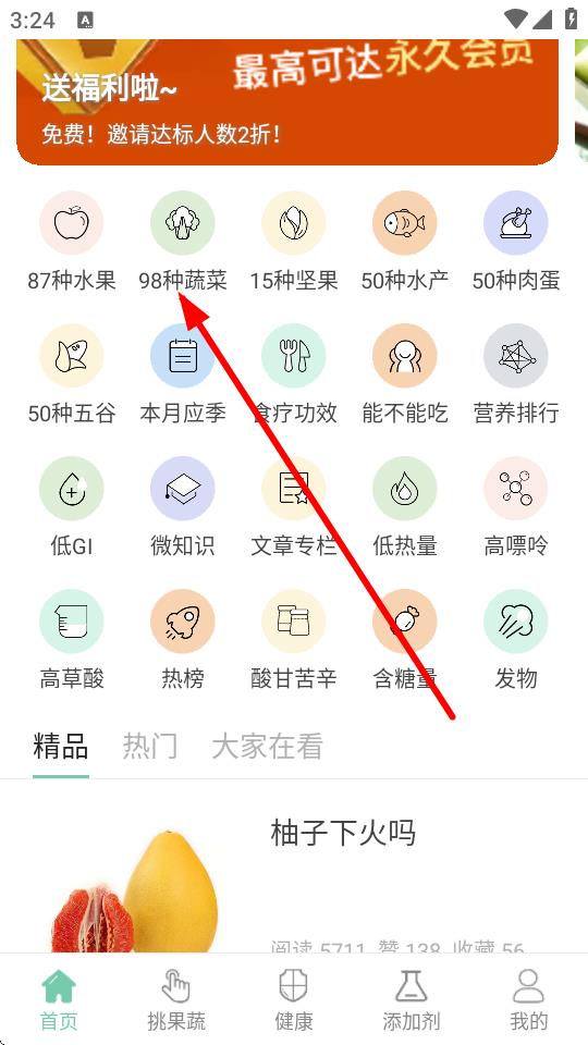 2、在首頁中點擊98種蔬菜,或者根據(jù)要挑選的產(chǎn)品類別,點擊87種水果、15種堅果等對應(yīng)類別。