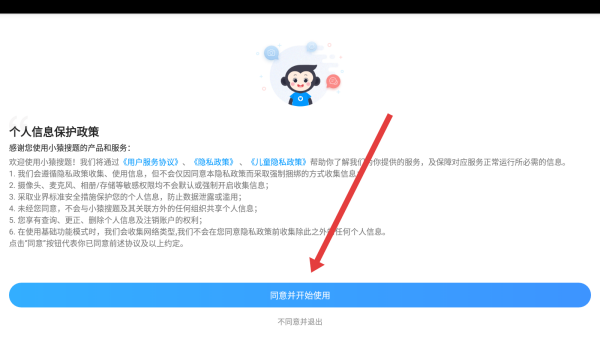 1、在個人信息保護政策頁面,點擊藍色同意并開始使用按鈕,進入登錄體驗功能界面,開啟賬號登錄的流程步驟。