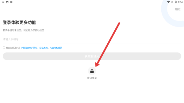 2、進入登錄界面后,點擊頁面中間的密碼登錄按鈕,切換至密碼登錄模式,顯示手機號與密碼的輸入框區(qū)域。