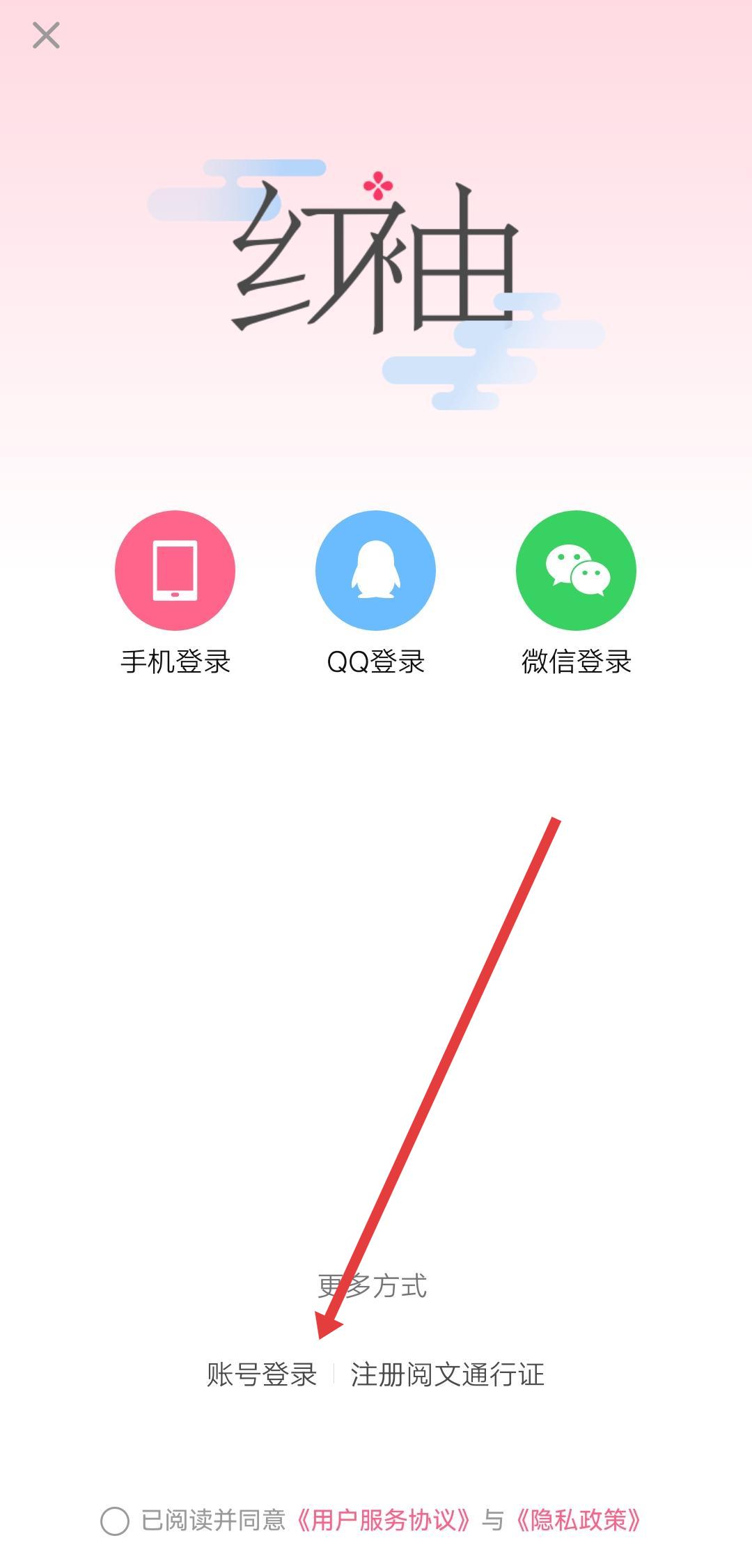 1、進入紅袖登錄界面,點擊下方賬號登錄,開啟閱文通行證注冊流程,這是賬號注冊的入口步驟。