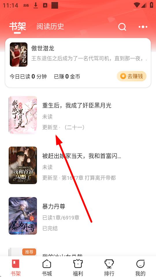 2、在書架中選擇想要閱讀的小說,比如點擊重生后,我成了奸臣黑月光。