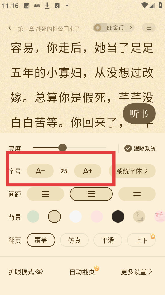 4、在設置界面里,找到字號一欄,通過點擊A-、A+來減小或增大字體,也可直接設置字號數值,調整到適合自己的字體大小。