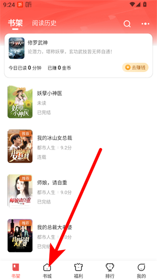 1、在閱友小說書架頁面,點擊書城選項,進入書城頁面。