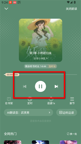 4、可通過播放控制區(qū)域的按鈕,進行播放、暫停、切換章節(jié)等操作,開始聽書。