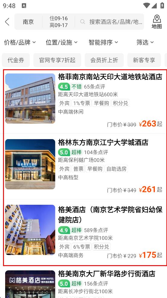 4、選擇好城市后,軟件會展示該城市的酒店列表,可根據(jù)價格、位置、評分等因素,從列表中挑選心儀的酒店,進行后續(xù)預(yù)訂操作。
