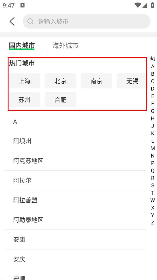 3、在城市選擇頁面,可從熱門城市或按字母順序排列的城市列表中,選擇想要預(yù)訂酒店的城市,比如選擇“南京”。