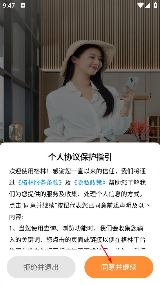 1、打開格林軟件,彈出“個人協(xié)議保護指引”頁面,點擊“同意并繼續(xù)”按鈕,進入軟件主界面。